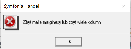 Podczas próby wydruku dokumentu program zwraca komunikat "Zbyt małe marginesy lub zbyt wiele kolumn", dokument nie zostaje wydrukowany.