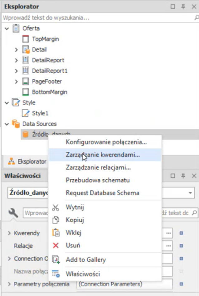 W celu dodania zdjęcia lub grafiki na pozycji do wydruku dokumentu należy w edytorze wydruku przejść do sekcji Eksplorator -> Źródło danych -> PPM -> Zarządzanie kwerendami.