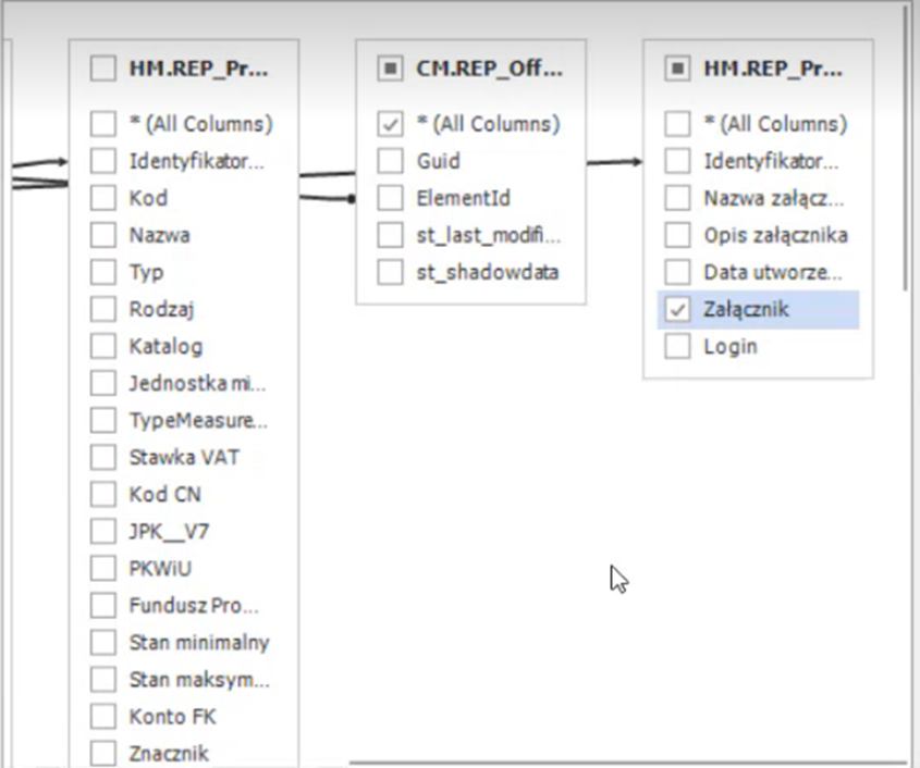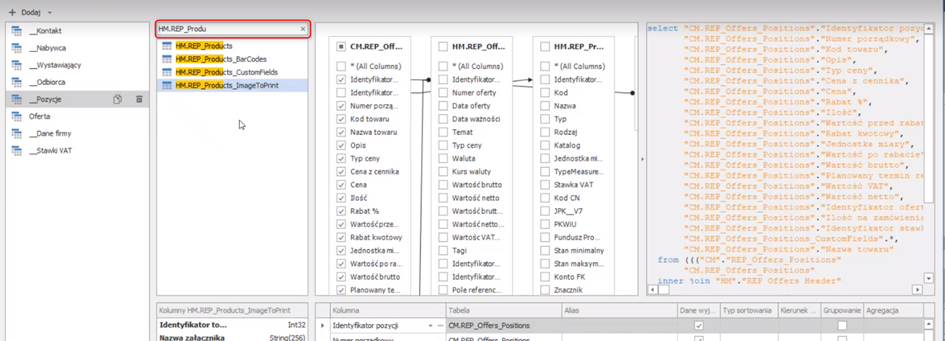 W oknie po prawej wpisać HM.REP_Products i wybrać z listy poniżej HM.REP_Products_ImageToPrint i tą opcję należy przeciągnąć w prawo do okna z tabelami.
