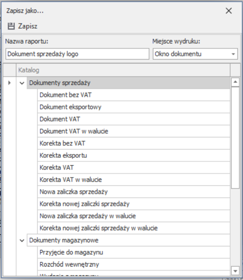 Po wybraniu pliku należy zapisać szablon poprzez zapisz jako... i w nazwie raportu należy wprowadzić dopisek który będzie wskazywał na to, że jest to wydruk z logiem firmy.