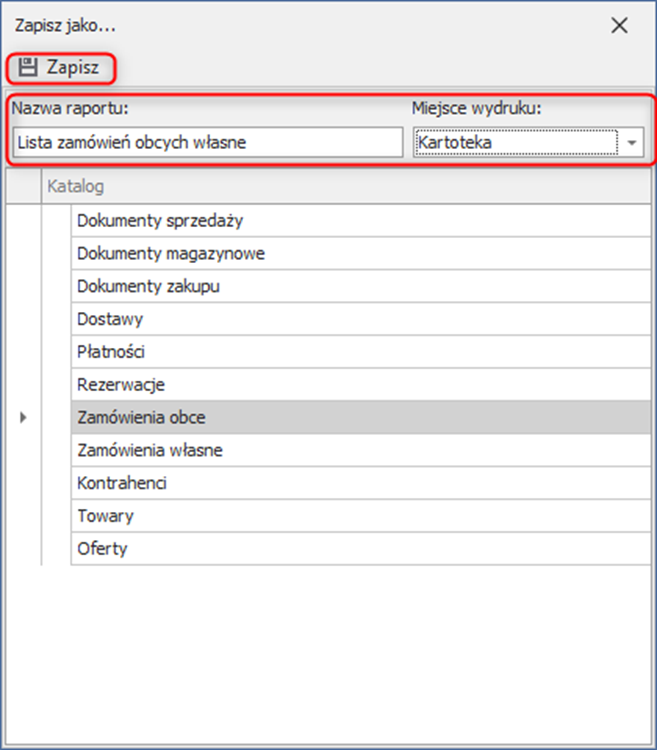 W tym oknie ustalamy nazwę raportu i wybieramy Miejsce wydruku: Kartoteka i klikamy Zapisz.