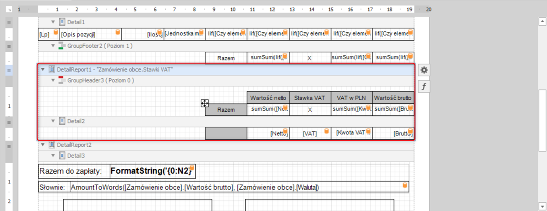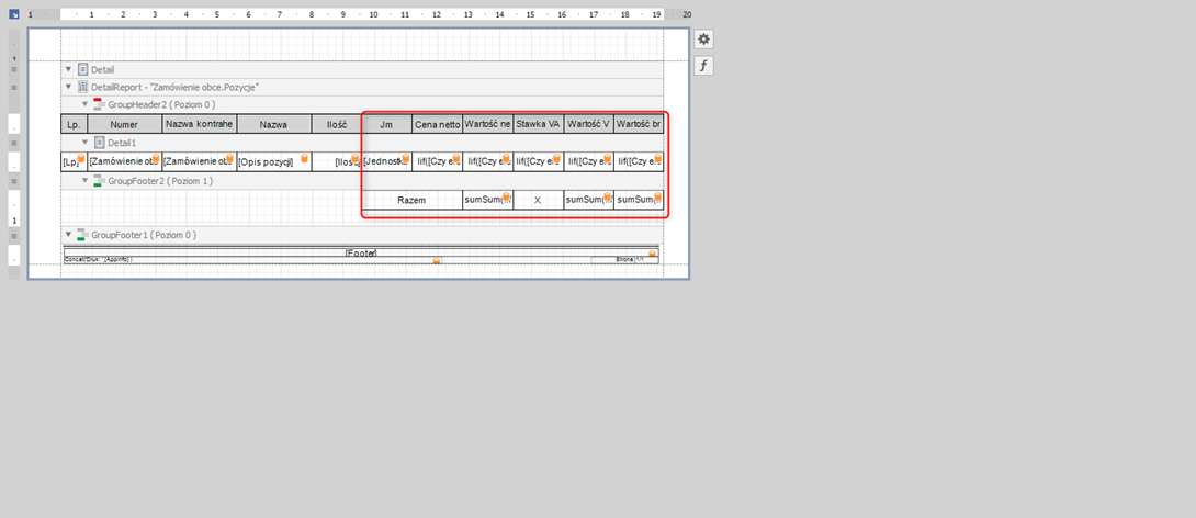 W tym momencie zostało tylko wyrównać szerokości kolumny w sekcji „GroupFooter2” tak, aby wyrównywały się z szerokością kolumn z sekcji powyżej.