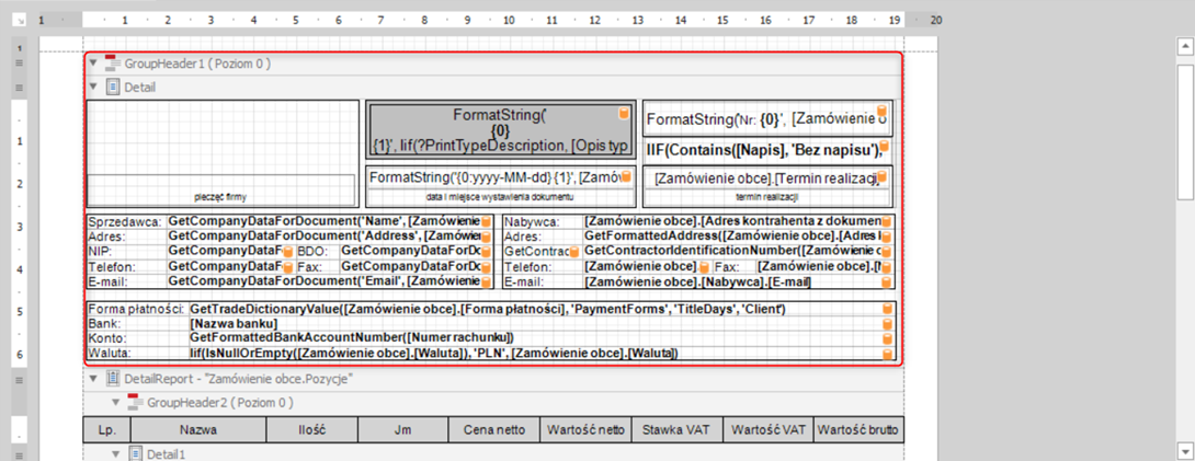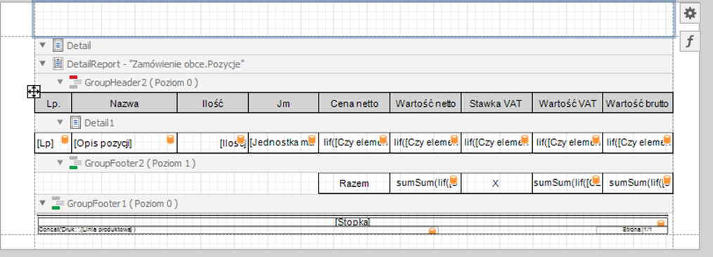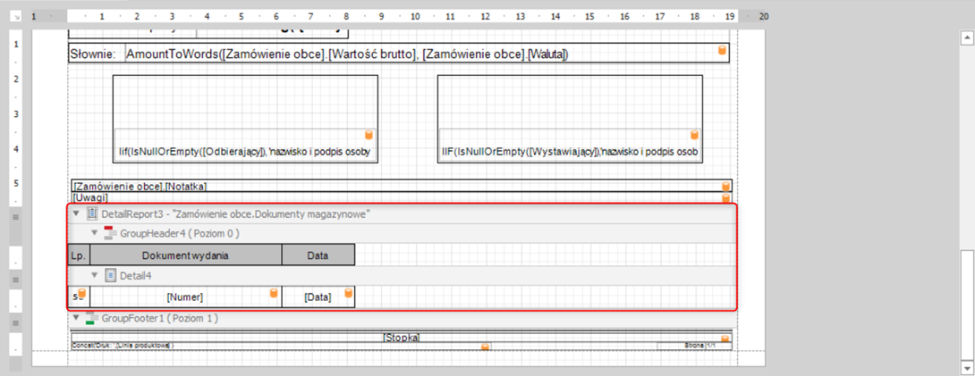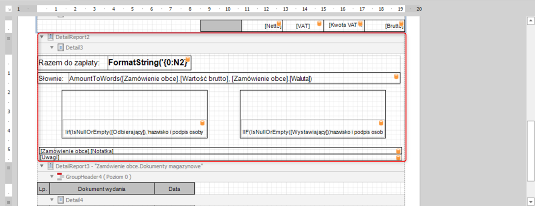 Zostawiamy pustą sekcje „Detail” oraz „GroupHeader1”. Dane zostawimy w „DetailReport – „Zamówienie obce.Pozycje” w podsekcjach „GroupHeader2”, „GroupFooter2” oraz „GroupFooter1”. Po operacji usuwania powinniśmy otrzymać widok poniższy dokumentu.