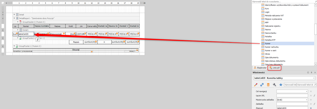 Zaznaczamy dodaną kolumnę znajdującą się pod nazwą kolumny „Numer”. Z okna po prawej stronie edytora wybieramy zakładkę lista pól i znajdujemy Zamówienia obce -> Numer.