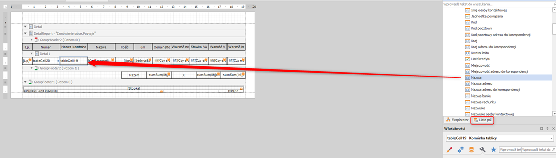 Zaznaczamy dodaną kolumnę znajdującą się pod nazwą kolumny „Nazwa kontrahenta”. Z okna po prawej stronie edytora wybieramy zakładkę Lista pól i znajdujemy Zamówienia obce -> Nabywca -> Nazwa. Wartość z tego okna przeciągamy do zaznaczonej kolumny.