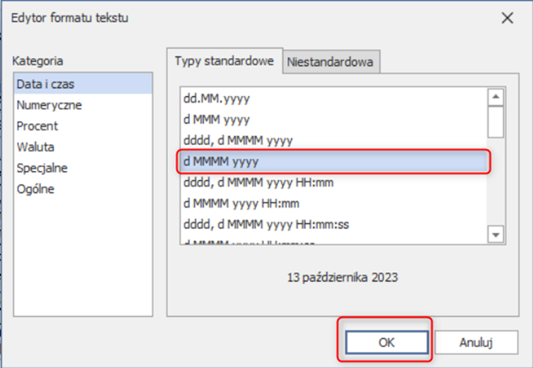 Jeżeli chcemy aby na wydruku pojawiła się data w formacie: