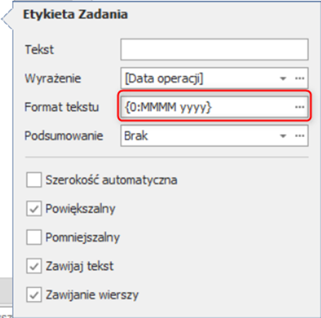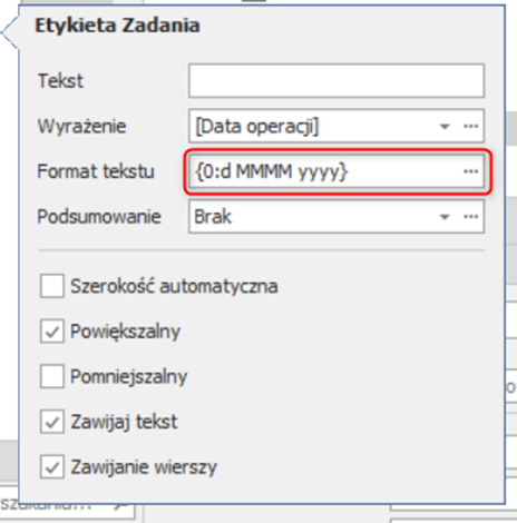 W oknie „Etykieta Zadania” w rubryce „Format tekstu” powinna zajść zmiana na format jaki wybraliśmy.