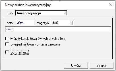 - W polu magazyn wybierz ten, którego ma dotyczyć tworzony arkusz.