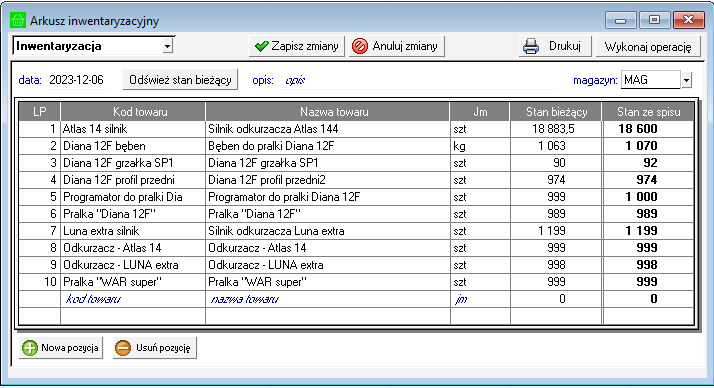 Arkusz inwentaryzacyjny zapisze się automatycznie po kliknięciu przycisku Wykonaj operację. Możesz do niego wrócić w celu jego wydruku lub zmian. Pamiętaj, że każde ponowne wybranie opcji Wykonaj operację utworzy nowe dokumenty w buforze magazynowym nie uwzględniając wcześniej utworzonych dokumentów. |