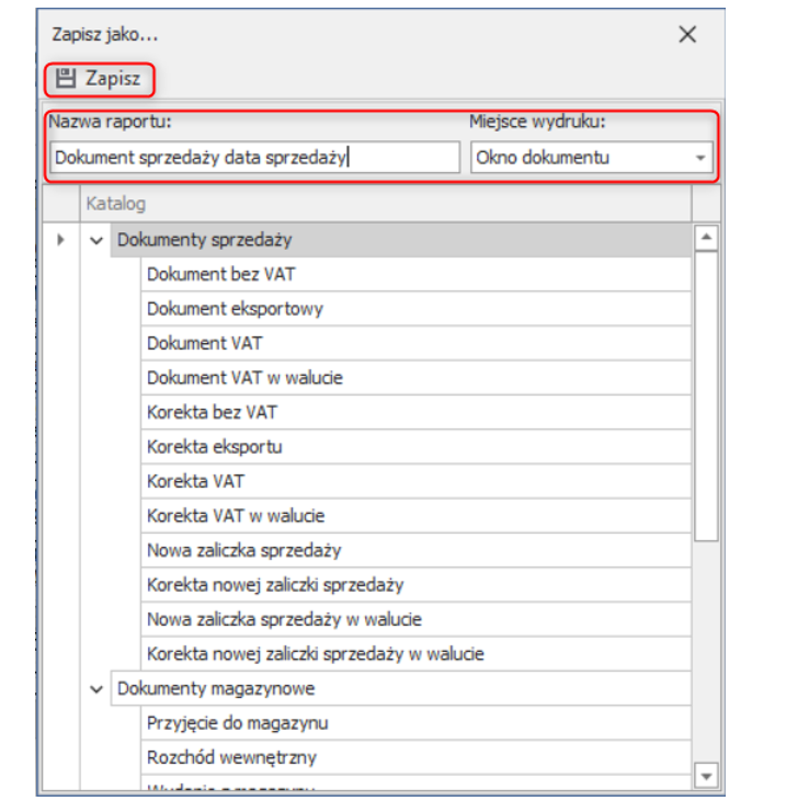 W poniższym oknie wprowadź nazwę raportu, wybierz miejsce wydruku i zapisz szablon.