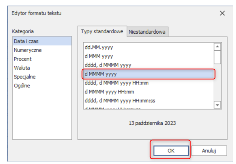 Pojawi się okno Edytor format tekstu z różnymi formatami daty.