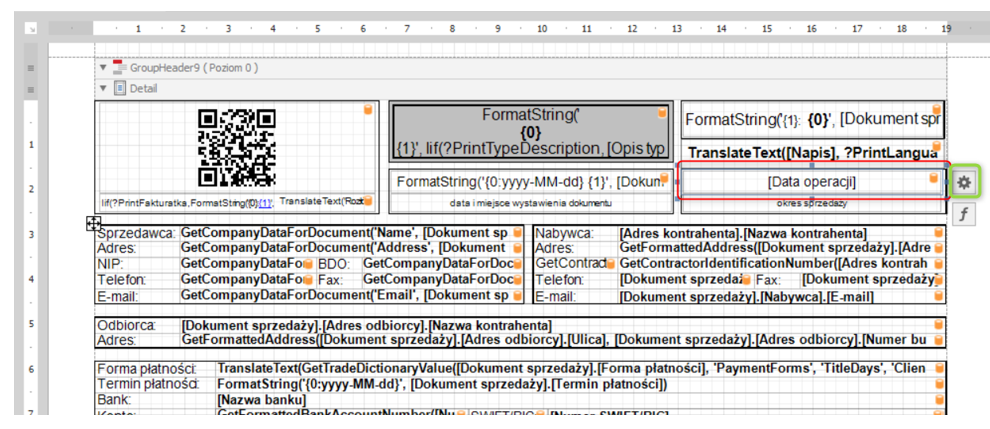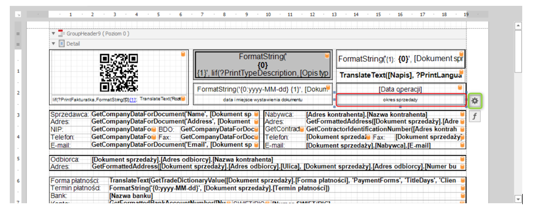 W celu zmiany formatu daty oraz okresu sprzedaż na datę sprzedaży na nowym wydruku dokumentu sprzedaży stworzonym w edytorze szablonów REPX, należy: