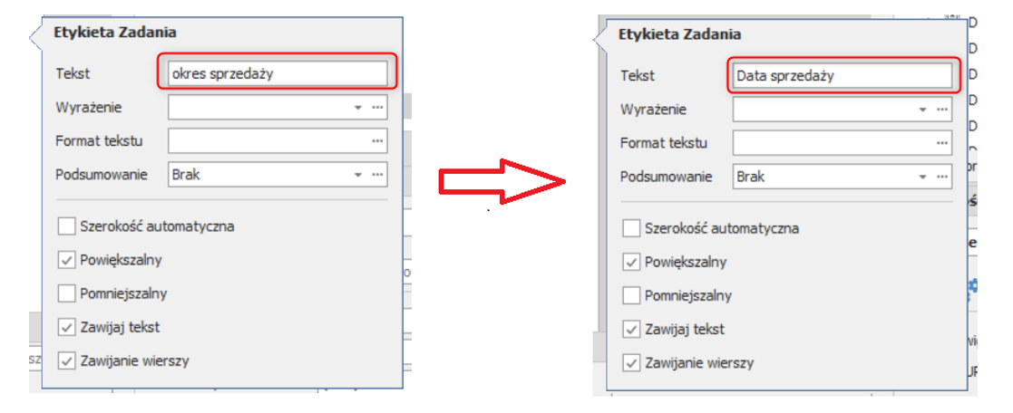 8. W oknie Etykieta zadania w rubryce Tekst zmień tekst wpisując data sprzedaży.