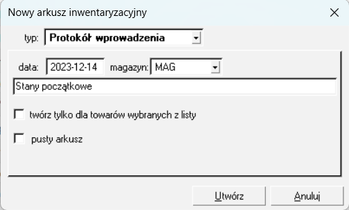 Parametr twórz tylko dla towarów wybranych z listy utworzy protokół wyłącznie dla zaznaczonych wcześniej towarów.