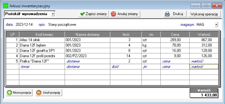 W nowej firmie stan początkowy towarów możesz wprowadzić protokołem wprowadzenia. W celu utworzenia protokołu: