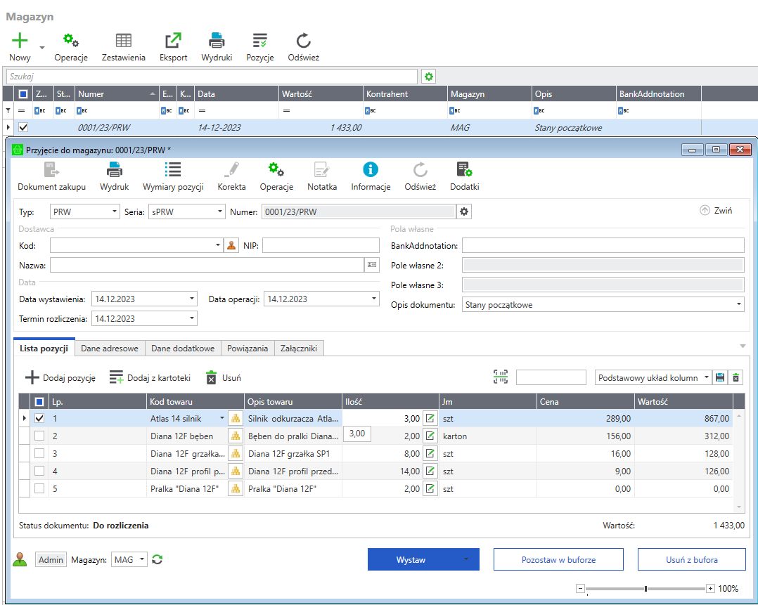 Po wystawieniu dokumentu towary zostaną wprowadzone na stany magazynowe.