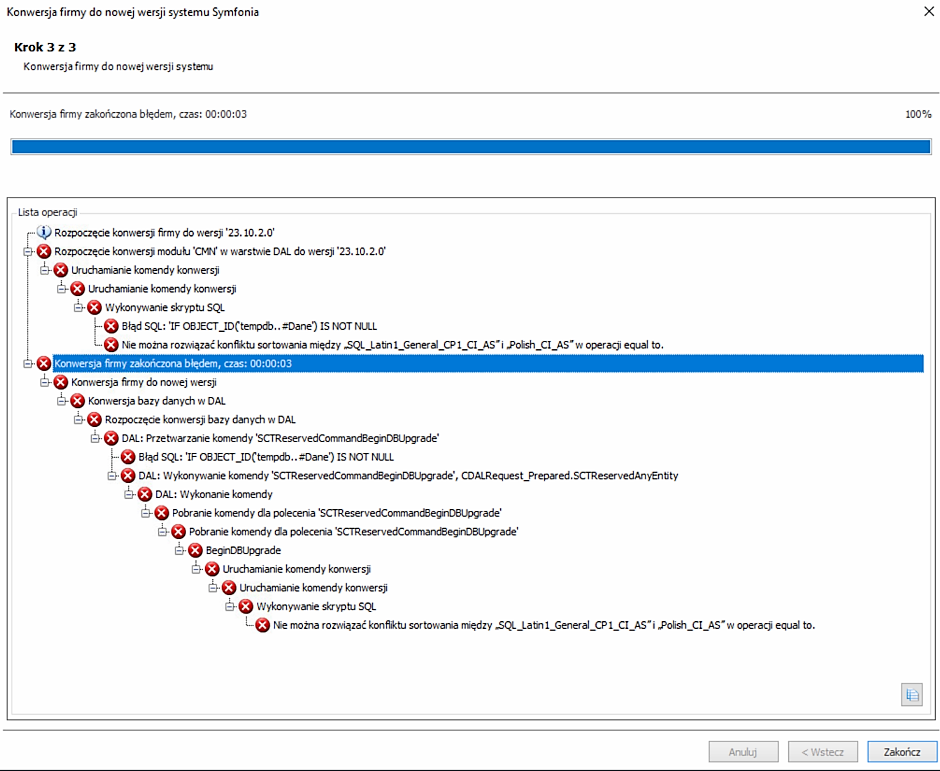 Podczas konwersji różnych modułów bazy danych do wersji 2023.1 system może zwracać błędy z rozbieżnością między parametrem Collation bazy danych, a Server Collation serwera Microsoft SQL Server: