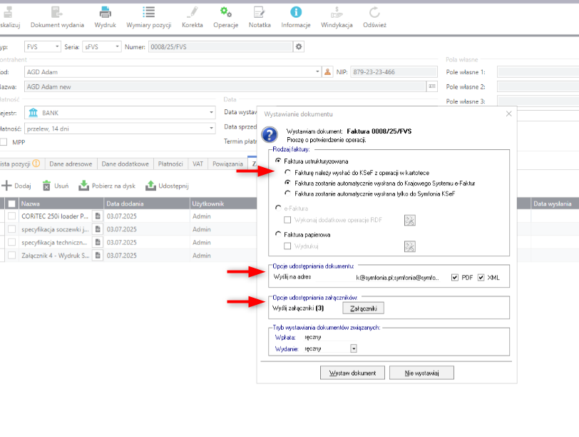 W instrukcji opisano sposób udostępnienia załączników razem z fakturą przesyłaną do KSeF. Uwzględniono również metody zabezpieczenia dostępu do plików, wybór trybu udostępniania i wskazanie adresatów powiadomień e-mail.