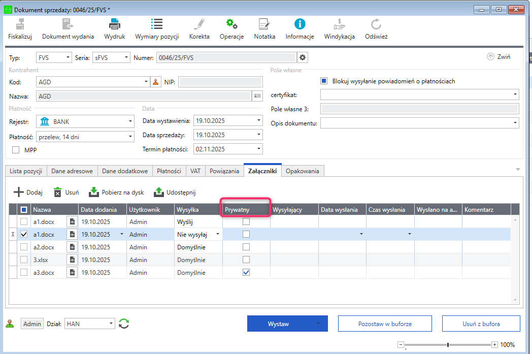 7. W kolumnie Prywatny oznacz, czy dany załącznik będzie widoczny dla odbiorcy.