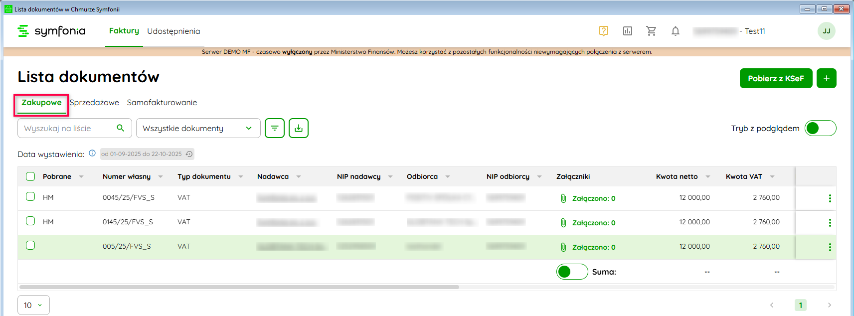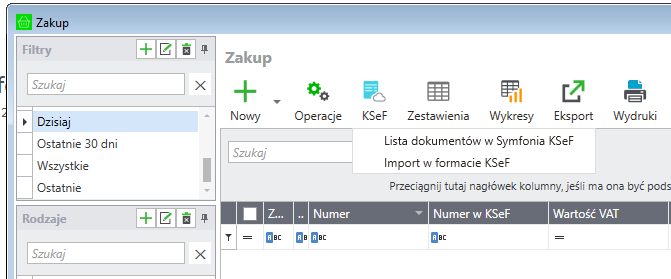 1. W Symfonii Handel przejdź do kartoteki Zakup → KSeF → Lista dokumentów w Symfonia KSeF.