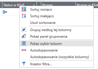 Aby dostosować widoczne kolumny, kliknij prawym przyciskiem myszy na nagłówku listy dokumentów w kartotece Zakup i wybierz z menu polecenie Pokaż wybór kolumn i wybierz kolumnę Status w KSeF.