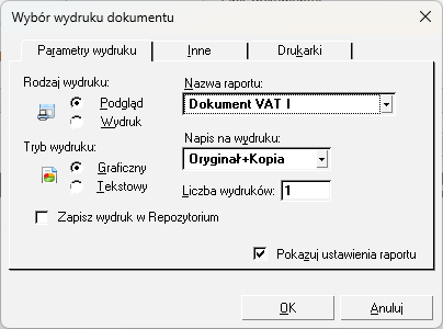 Wybierz opcję Wydruk faktury → Wydruk dokumentu (klasyczny) → w oknie Wybór wydruku dokumentu zaznacz parametr Pokazuj ustawienia raportu → OK