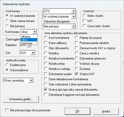 3. W oknie Ustawienia wydruku, wybierz kod towaru: obcy.