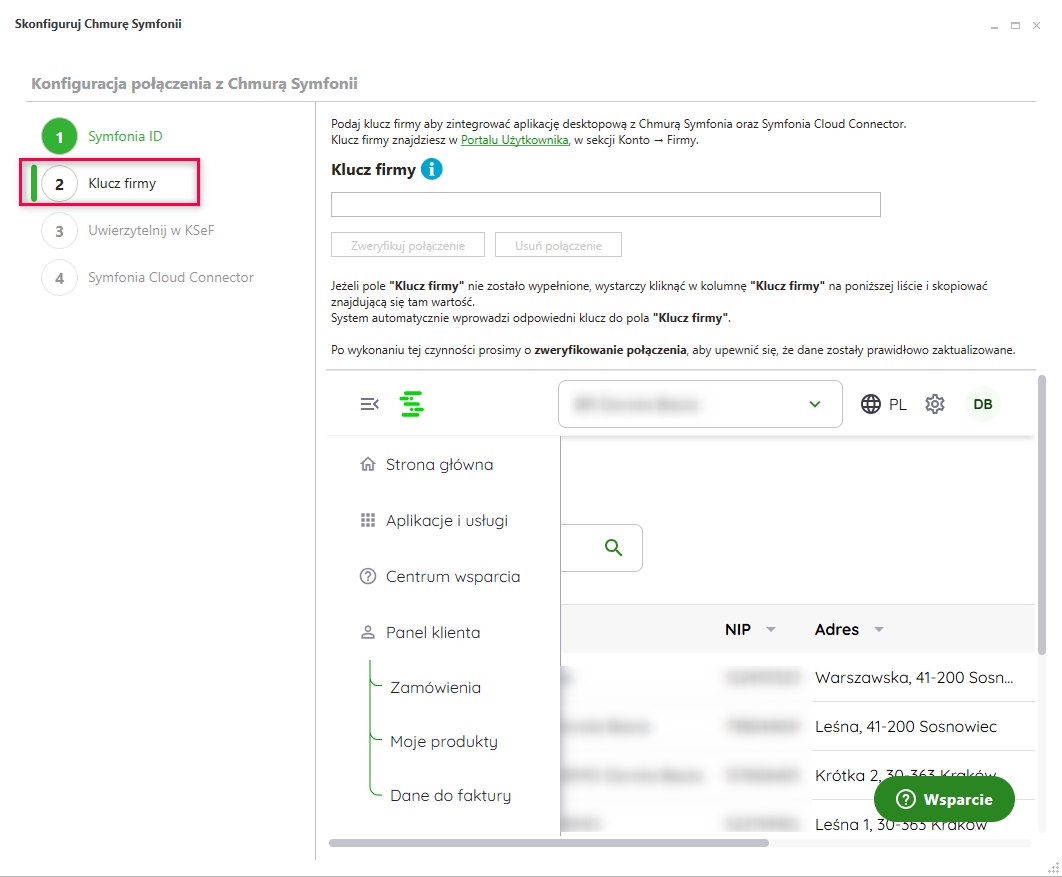 11. Kliknij niebieski przycisk Zweryfikuj połączenie, który znajduje się pod polem Klucz firmy. Kreator sprawdzi spójność danych łączonych firm.