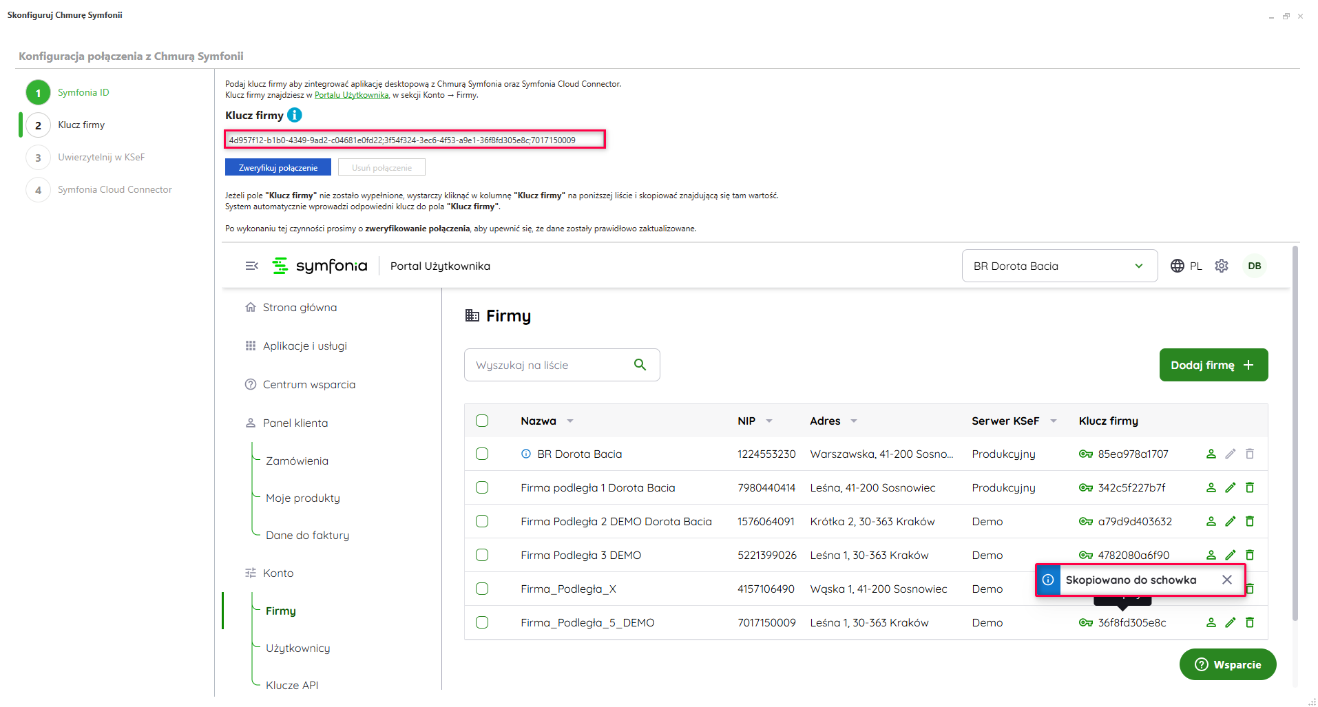 Klucz firmy zostanie skopiowany do schowka Windows i automatycznie wklejony do pola Klucz firmy, w górnej części okna konfiguracji.