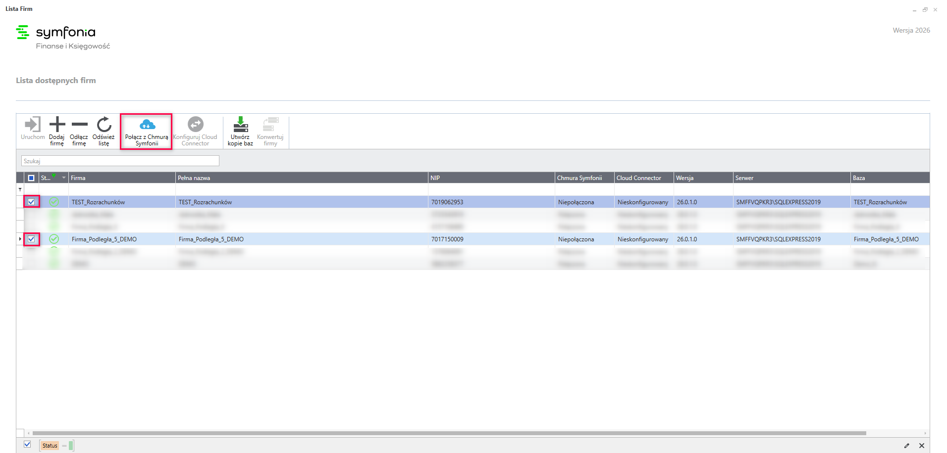 3. Na ekranie Lista dostępnych firm zaznacz te firmy, które chcesz połączyć z wybranym Kontem firmy głównej Chmurze Symfonii i kliknij przycisk Połącz z Chmurą Symfonii.