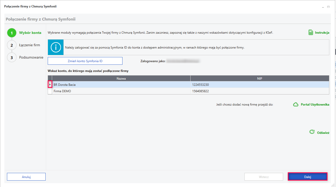 Ten kreator automatycznie połączy wybrane przez Ciebie firmy z kontem firmy głównej w Chmurze Symfonii. Dzięki temu konfiguracja będzie szybsza i wygodniejsza.