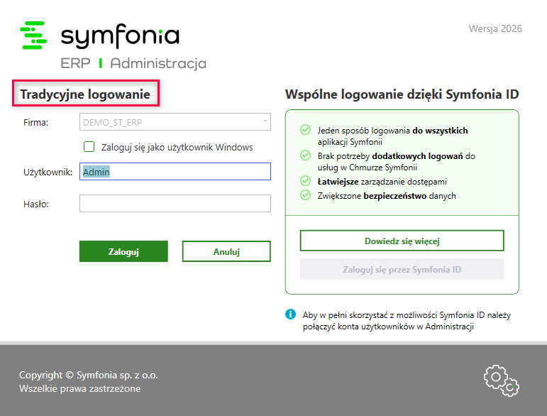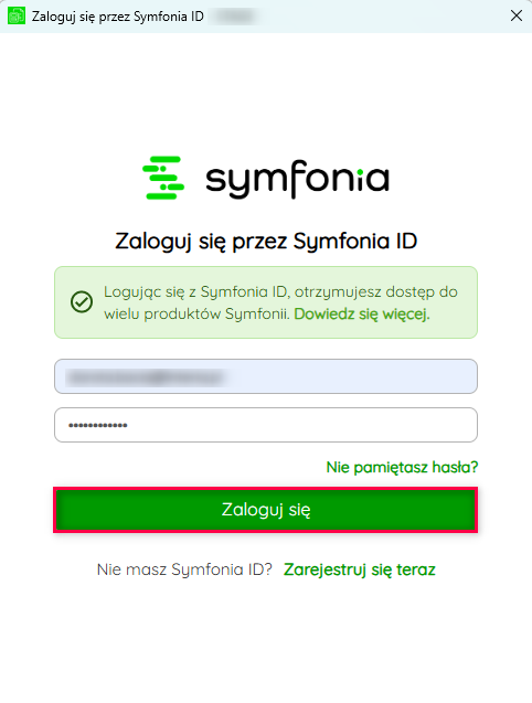 3. Aby zalogować się do programu przez Symfonia ID musisz najpierw połączyć firmę z Chmurą Symfonii oraz konto użytkownika programu z jego kontem Symfonia ID.