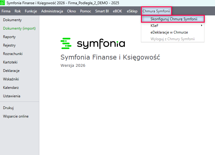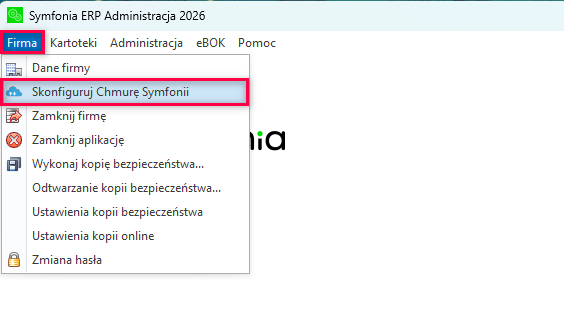 4. Przejdź do menu Chmura Symfonii Skonfiguruj Chmurę Symfonii.