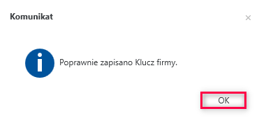 12. Zaakceptuj wyświetlony komunikat Poprawnie zapisano Klucz firmy przyciskiem OK.