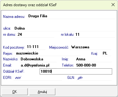 - W wyświetlonym oknie uzupełnij dane oddziału i wprowadź 5‑cyfrowy identyfikator oddziału/filii kontrahenta.