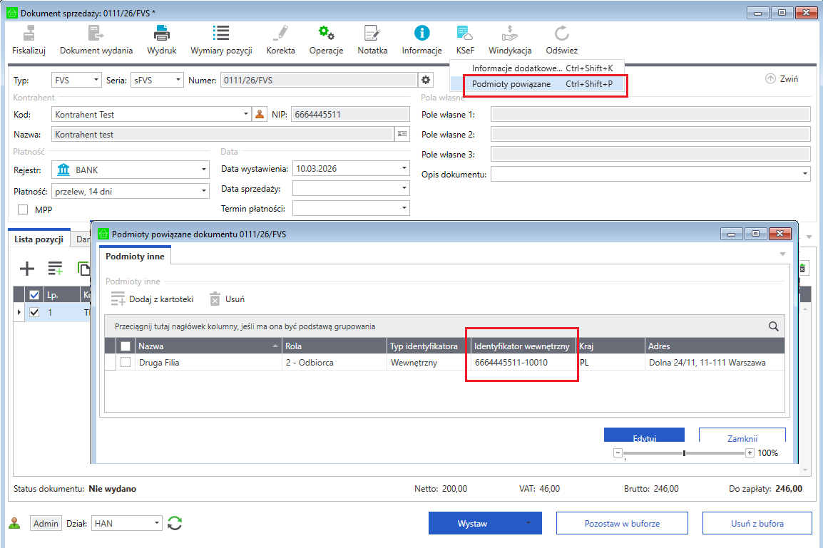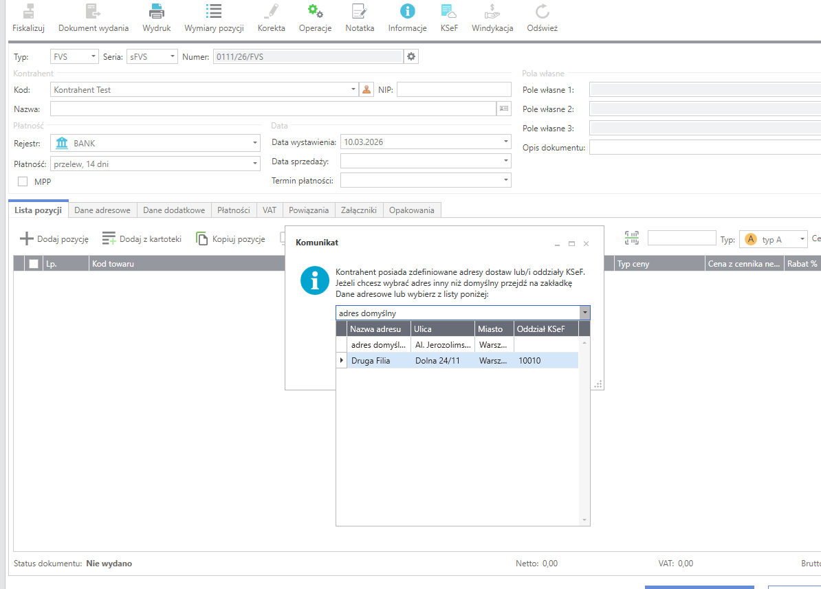 Po wybraniu kontrahenta w dokumencie sprzedaży system automatycznie sprawdza, czy ma on przypisane oddziały KSeF.