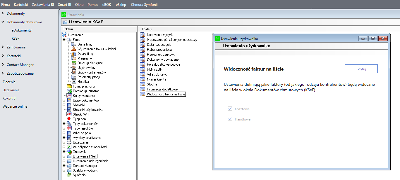 Od wersji 2026.1 systemu Symfonia Handel i Symfonia ERP Handel wprowadzono rozbudowane ustawienia dotyczące widoczności faktur w oknie Faktury KSeF. Okno to znajduje się w Handlu w zakładce Dokumenty chmurowe → KSeF Zmiany te pozwalają precyzyjnie określić, od jakiego rodzaju kontrahentów kosztowych lub handlowych, dokumenty będą prezentowane na liście i dostępne do pobrania. Dzięki temu użytkownik może lepiej kontrolować przepływ dokumentów oraz dostosować widok do specyfiki pracy firmy.