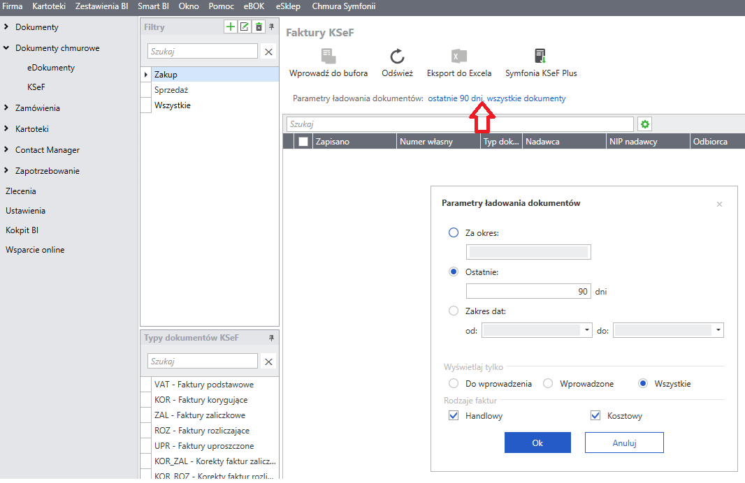Okno Parametry ładowania dokumentów w oknie Faktury KSeF pojawią się po kliknięciu zakładki ostatnie 90 dni, wszystkie dokumenty.