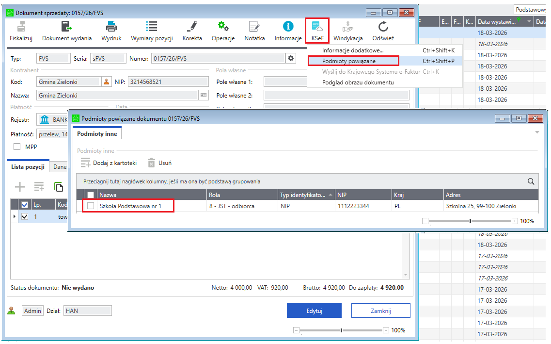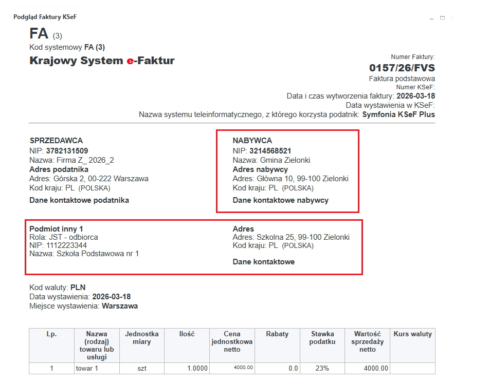 Po zaznaczeniu parametru Jednostka ST system automatycznie rozpoznaje rolę JST przy generowaniu dokumentów sprzedaży i przypisuje odbiorcę jako podmiot powiązany w dokumentach.