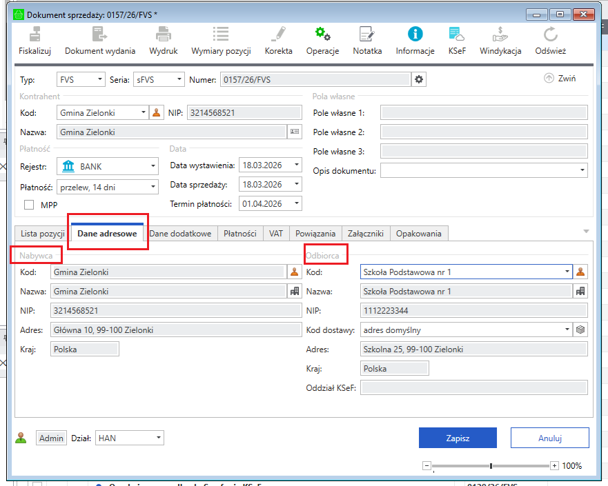 Podczas wystawiania faktury sprzedaży wybieramy Nabywcę – Gminę, a Odbiorcę – Szkołę.