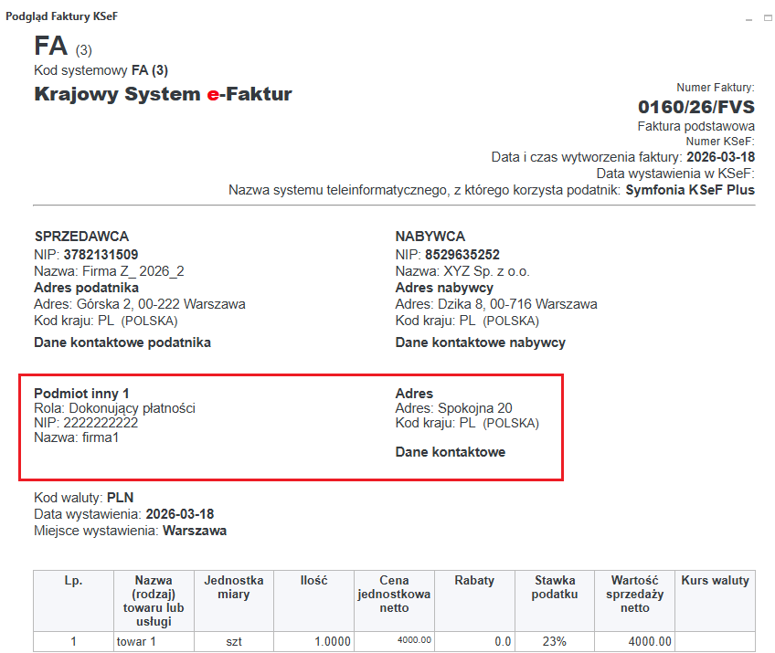 Dane Nabywcy wysyłane są do KSeF w sekcji Podmiot2, natomiast dane Płatnika znajdują się w fakturze ustrukturyzowanej KSeF w dodatkowej sekcji Podmiot3, z rolą 6 – Dokonujący płatności.