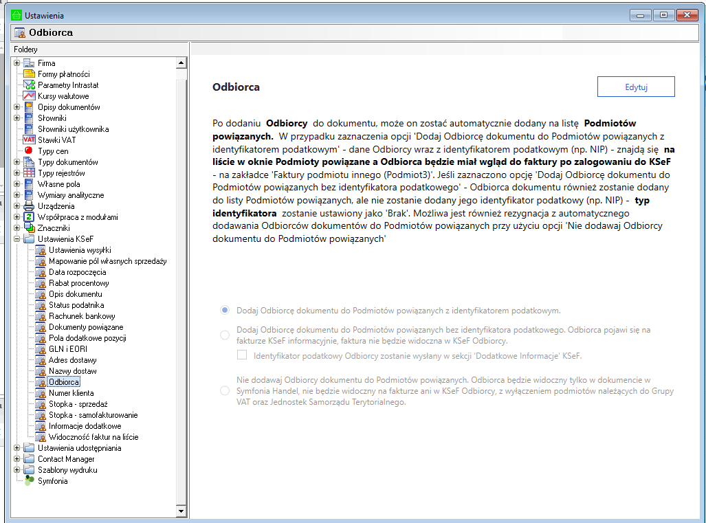 Parametry w grupie Ustawienia KSeF → Odbiorca służą do określenia, czy kontrahent wskazany jako odbiorca dokumentu ma zostać automatycznie dodany do listy Podmiotów powiązanych oraz w jaki sposób ma być identyfikowany (z identyfikatorem podatkowym lub bez niego).