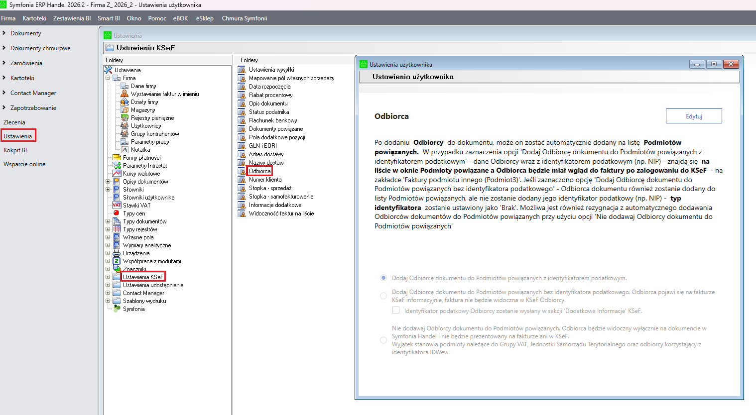- Przeprowadź następujące czynności w Symfonii ERP Handel w wersji 2026.2.