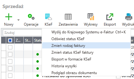 - Z górnego menu wybierz opcję KSeF → Zmień rodzaj faktury