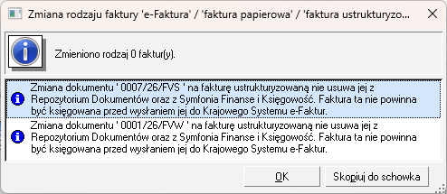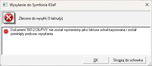 Jeśli dokument nie został wystawiony jako faktura ustrukturyzowana przy wysyłce do KSeF pojawi się komunikat: Dokument... ...nie został wystawiony jako faktura ustrukturyzowana i został pominięty podczas wysyłania.