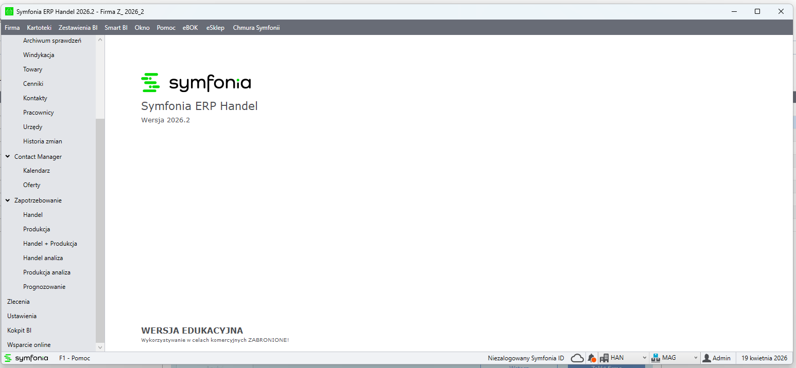 Po uruchomieniu programu Symfonia ERP Handel zobaczysz główne okno aplikacji. To właśnie interfejs, czyli przestrzeń, w której będziesz na co dzień pracować czyli wystawiać dokumenty, zarządzać towarami i obsługiwać kontrahentów.