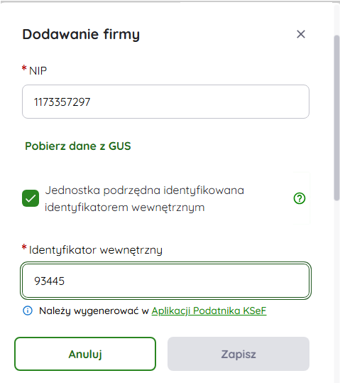 W tym celu w Chmurze Symfonii trzeba utworzyć firmę odpowiadającą jednostce organizacyjnej (np. przedszkolu), przypisaną do NIP-u jednostki nadrzędnej, a następnie nadać jej wygenerowany identyfikator wewnętrzny (ID Wew). Dzięki temu możliwe będzie prawidłowe powiązanie danych oraz zapewnienie zgodności z centralnym rozliczaniem w ramach JST.