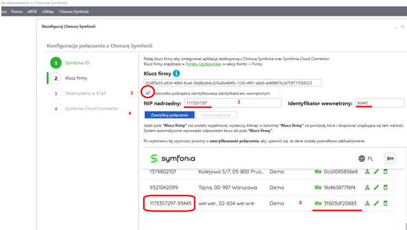 Po uzupełnieniu tych danych należy przejść do kolumny „Klucz firmy”, gdzie wybiera się wcześniej zdefiniowaną firmę w Chmurze Symfonii.