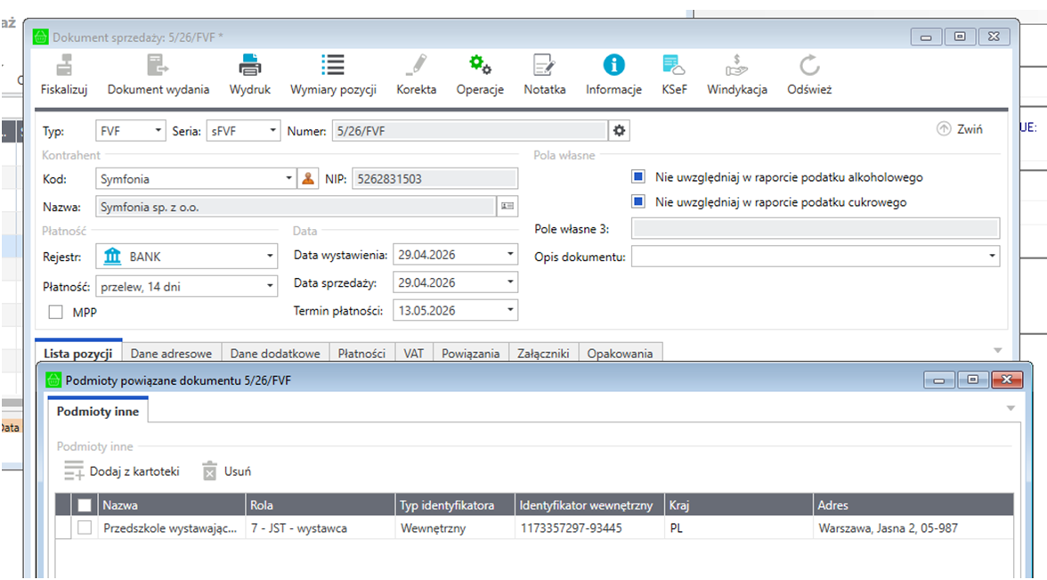 - Podmiot 1 – dane sprzedawcy, pobierane z okna „Wystaw w imieniu”,